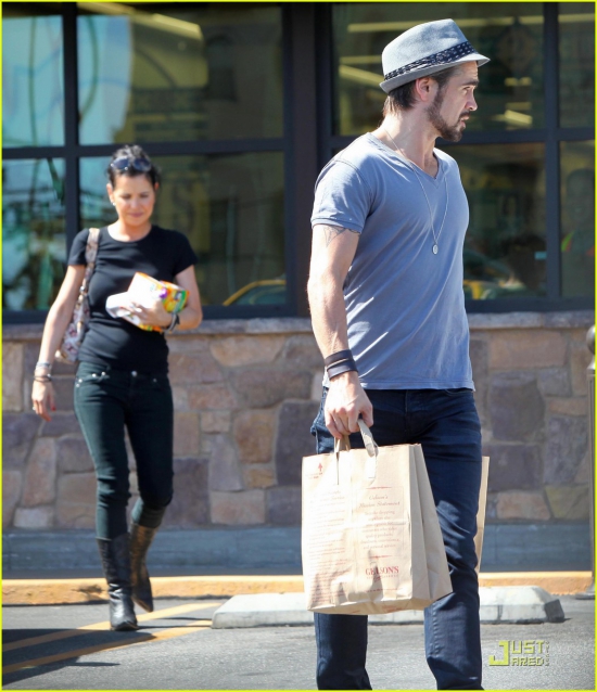 Колин Фаррелл на выходе из супермаркета Лос-Анджелеса был сфотографирован папарацци. На фото у Колина обычный, более знакомый нам вид, если учесть, что он снимается в картине «Несносные боссы«, где он с проплешиной на голове и с пузом. От того противного мужика из съемок осталась только борода. Сзади Коляна идет незнакомка, делая вид, что не с ним. Однако папарацци утверждают, что они были вместе. Кто она?